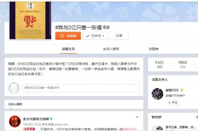 自前幾天支付寶將“集5福,搶2億+紅包”的活動(dòng)規(guī)則公布后,一時(shí)間,有關(guān)福卡換贈(zèng)的話題強(qiáng)行霸屏。在有金字粉絲集齊了五福后,金字順勢(shì)在微博平臺(tái)上策劃的#我與2億只差一張???的微話題就引發(fā)了高達(dá)4.6億的閱讀量,網(wǎng)友們通過(guò)點(diǎn)贊評(píng)論及轉(zhuǎn)發(fā)分享的方式,第一時(shí)間表達(dá)了自己對(duì)于五福??ê痛和?億紅包的高度期待!
