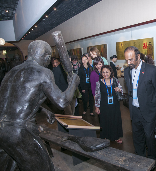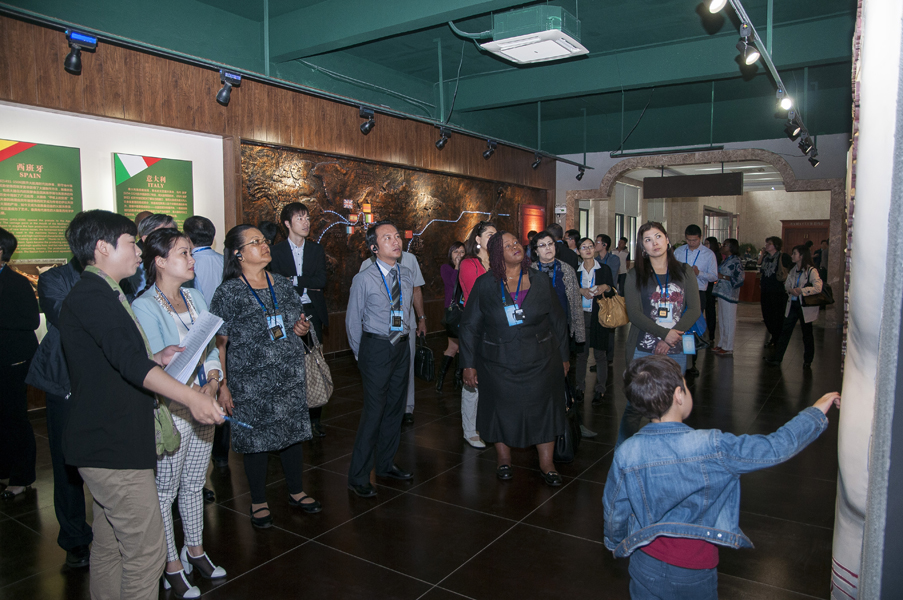 從一進(jìn)中國火腿博覽館的大門開始,使節(jié)們就被眼前精美的浮雕所吸引。透過金字火腿吳月肖副總經(jīng)理有趣的解說和翻譯的詳盡翻譯,50余人才搞明白:原來這就是著名的《百姓勞軍圖》,而使節(jié)中的一些“中國通”發(fā)現(xiàn)他們熟知岳飛的師傅宗澤,原來竟然是金華火腿的祖師爺,火腿原料金華兩頭烏如此有趣珍貴,就好比中國的熊貓。